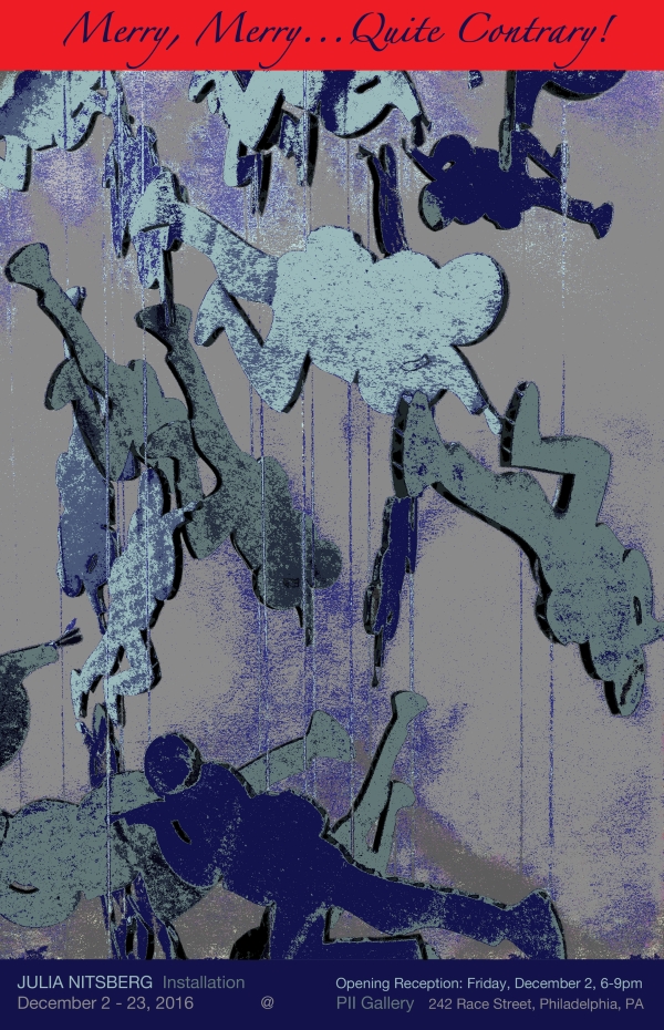 "Merry, Merry... Quite Contrary!" - a mixed media sculptural installation is specifically designed for PII gallery located in the Old City of Philadelphia, the birthplace of the nation. It is significant that the exhibition will take place in December, a month of traditional holidays and reflections on the past yearly accomplishments; and this year in particular - on the aftermath of presidential election. The installation is both visual and social commentary on the world shaken by disasters and political instabilities generated by a twofold phenomenon: accumulation of wealth and political control by a corporate few and the escalation of destruction and distress due to the spreading of armed conflicts around the globe.