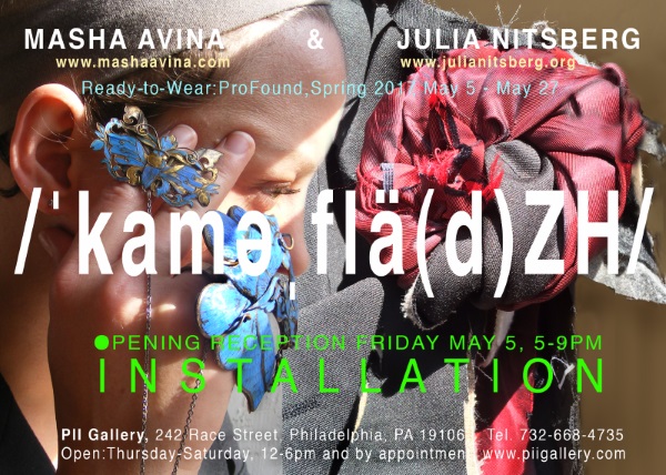 Philadelphia International Institute is pleased to announce: /ˈkaməˌflä(d)ZH/ - a new interactive installation, presented as a fashion show of ProFound Spring 2017, that opens Friday, May 5th, at 5pm, and will be followed by the artists’ reception 6-9pm. The exhibition and sale will continue through Saturday, May 26. The opening party starts with a runway performance - a procession of models will march down a golden catwalk to the soundtrack of military marches, cadences and chants.